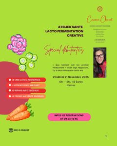- deux bocaux de légumes lacto-fermentés qui seront réalisés lors de l’atelier et que vous ramènerez à la maison
