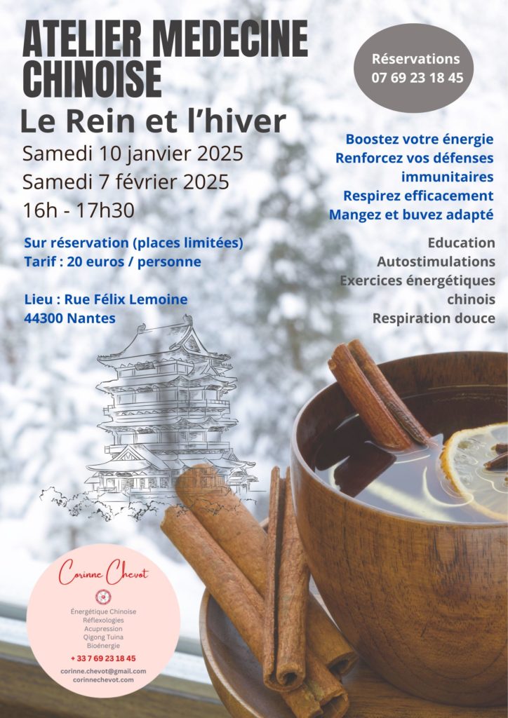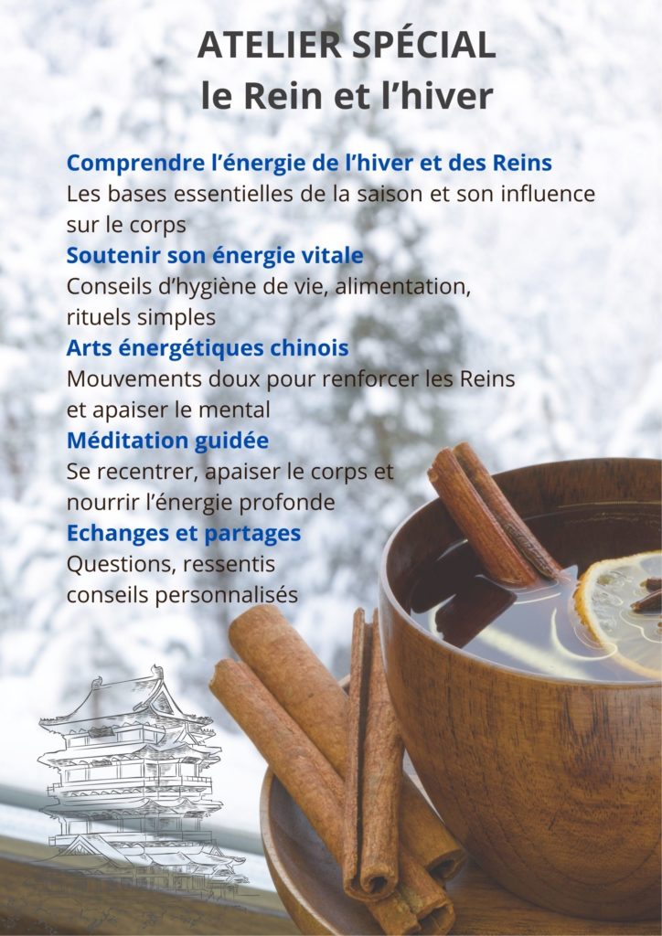 Je vous propose un atelier sur le Rein et l’Hiver : que faire en Hiver et pourquoi, quelle est la particularité de cette saison, quel organe est en lien avec elle…
